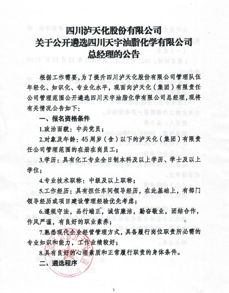 關于公開遴選四川天宇油脂化學有限公司總經理的公告